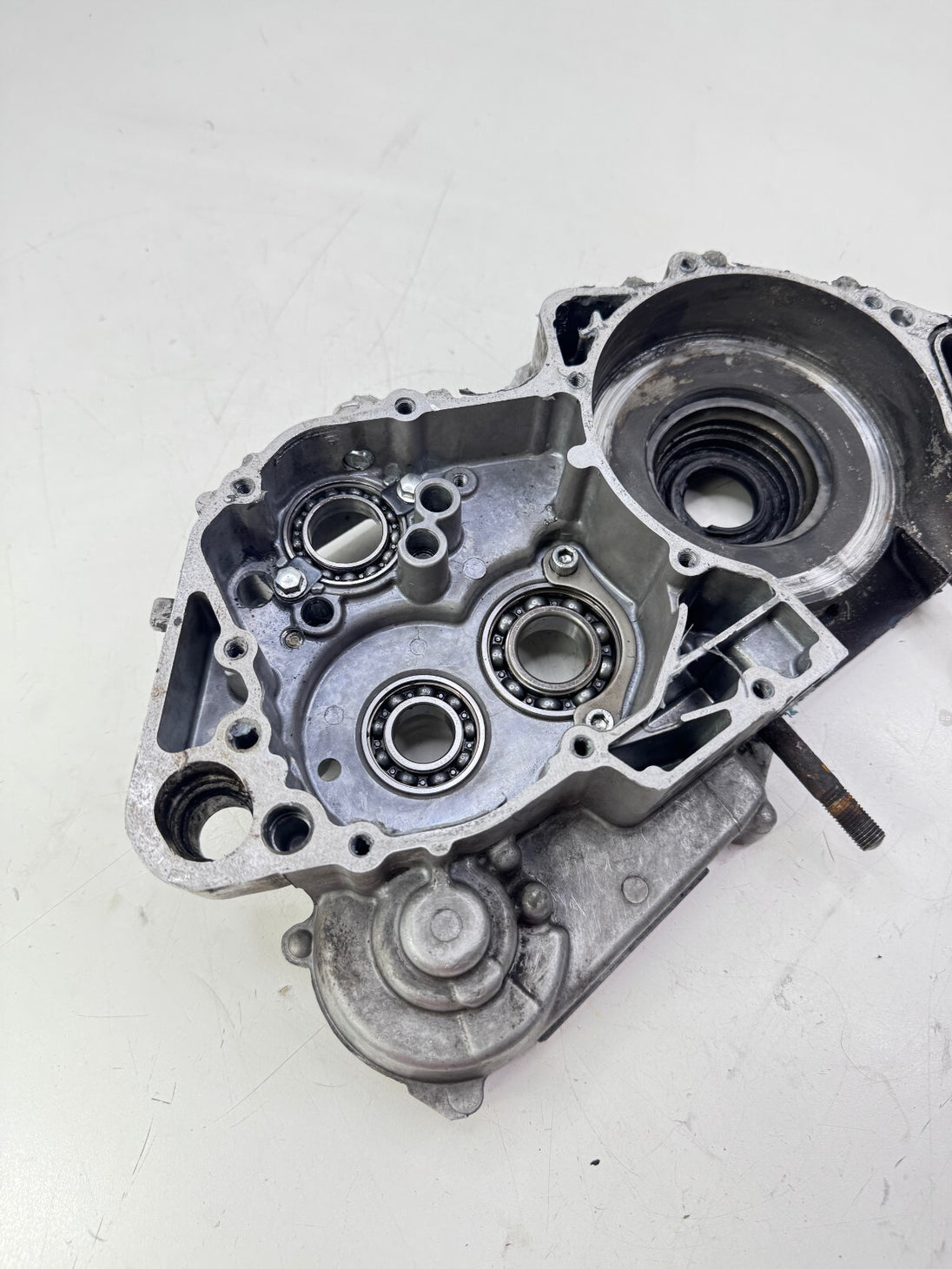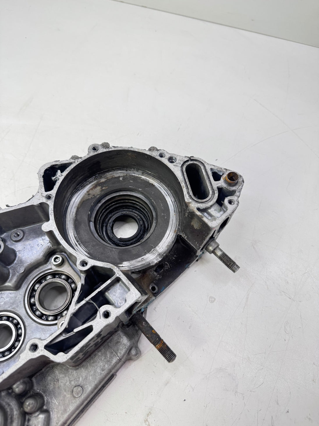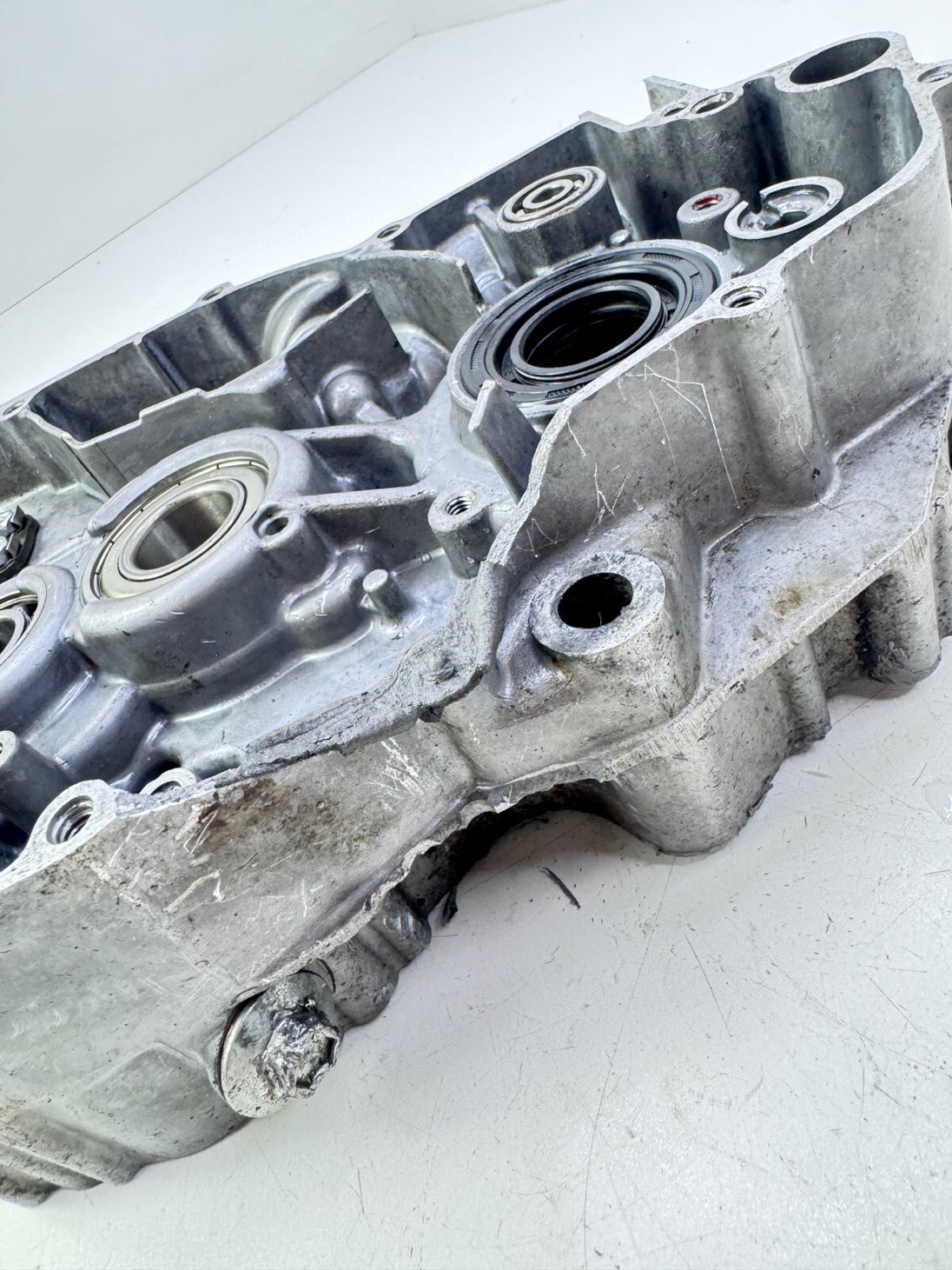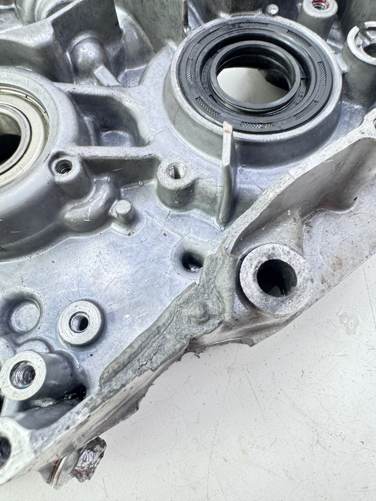 Repaired as picture on the lower clutch side, should work as it should possibly JB weld job needed. Crank housing has wear aswell as the bearing journel/race